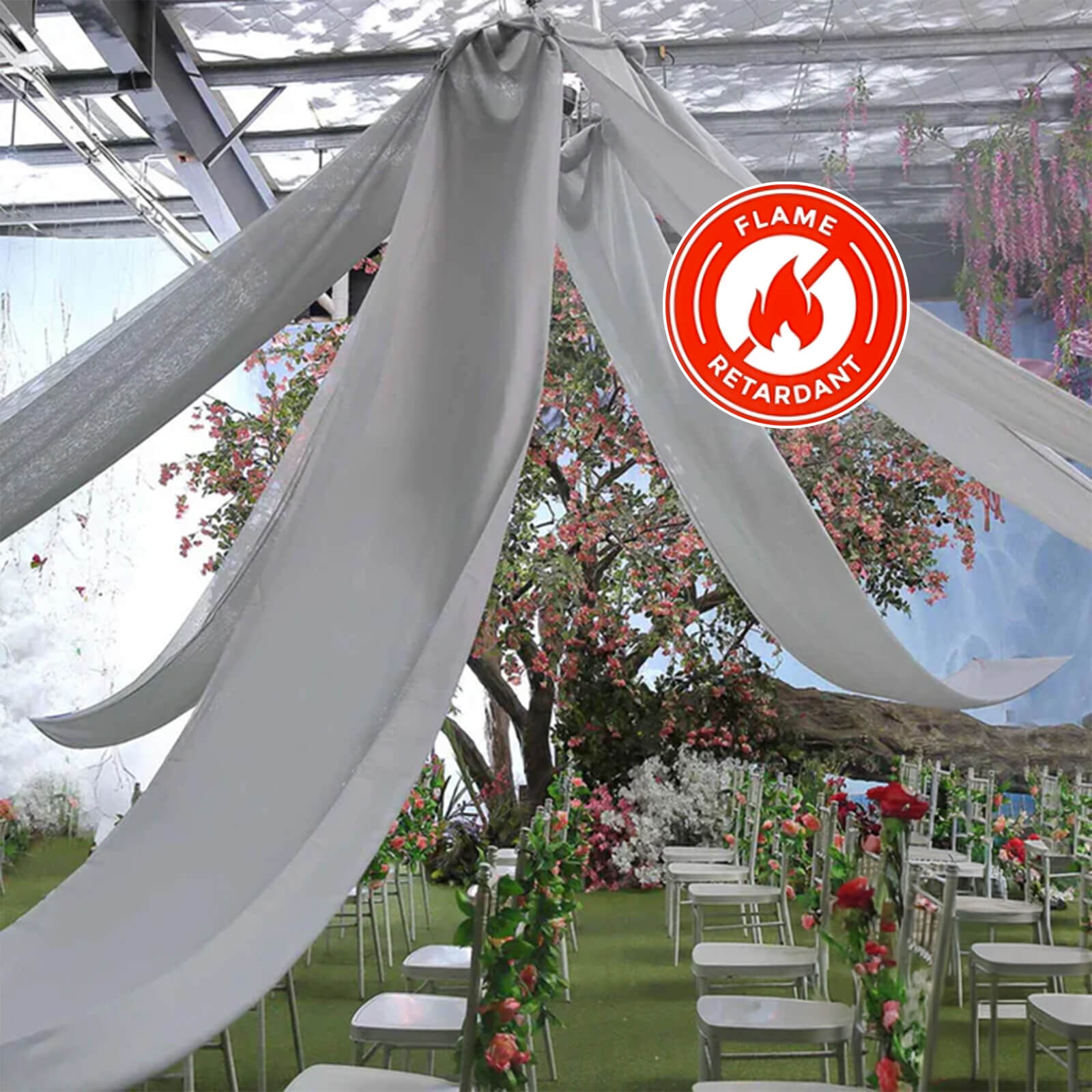 Material: Chiffon Fabric. Flame-retardant finish that can withstand multiple cleanings without needing to be retreated. |