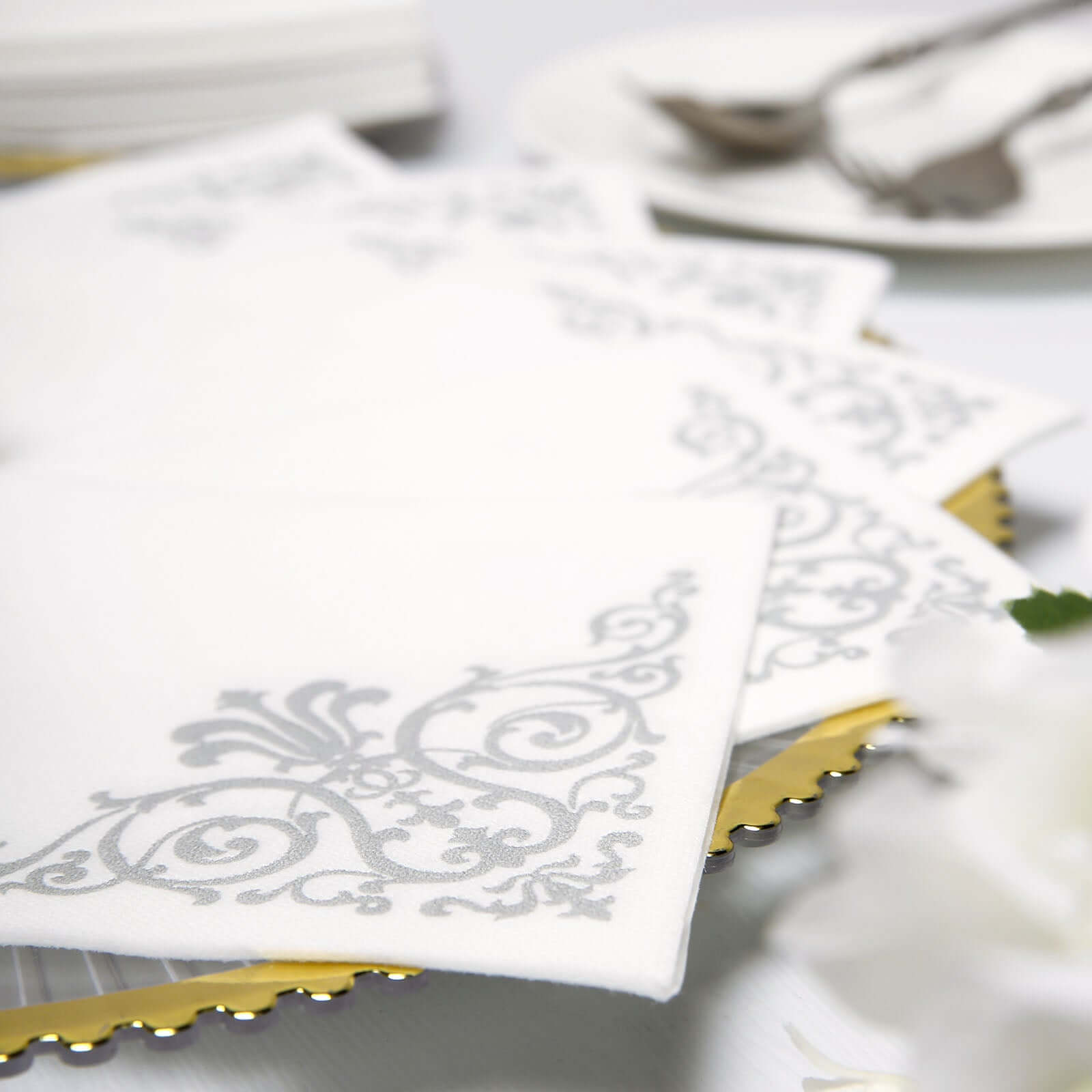 20 Pack Linen-Like Paper 5"x5" Napkins White - Silver Fleur Vintage Design - Classy Airlaid Cocktail Napkins for Events