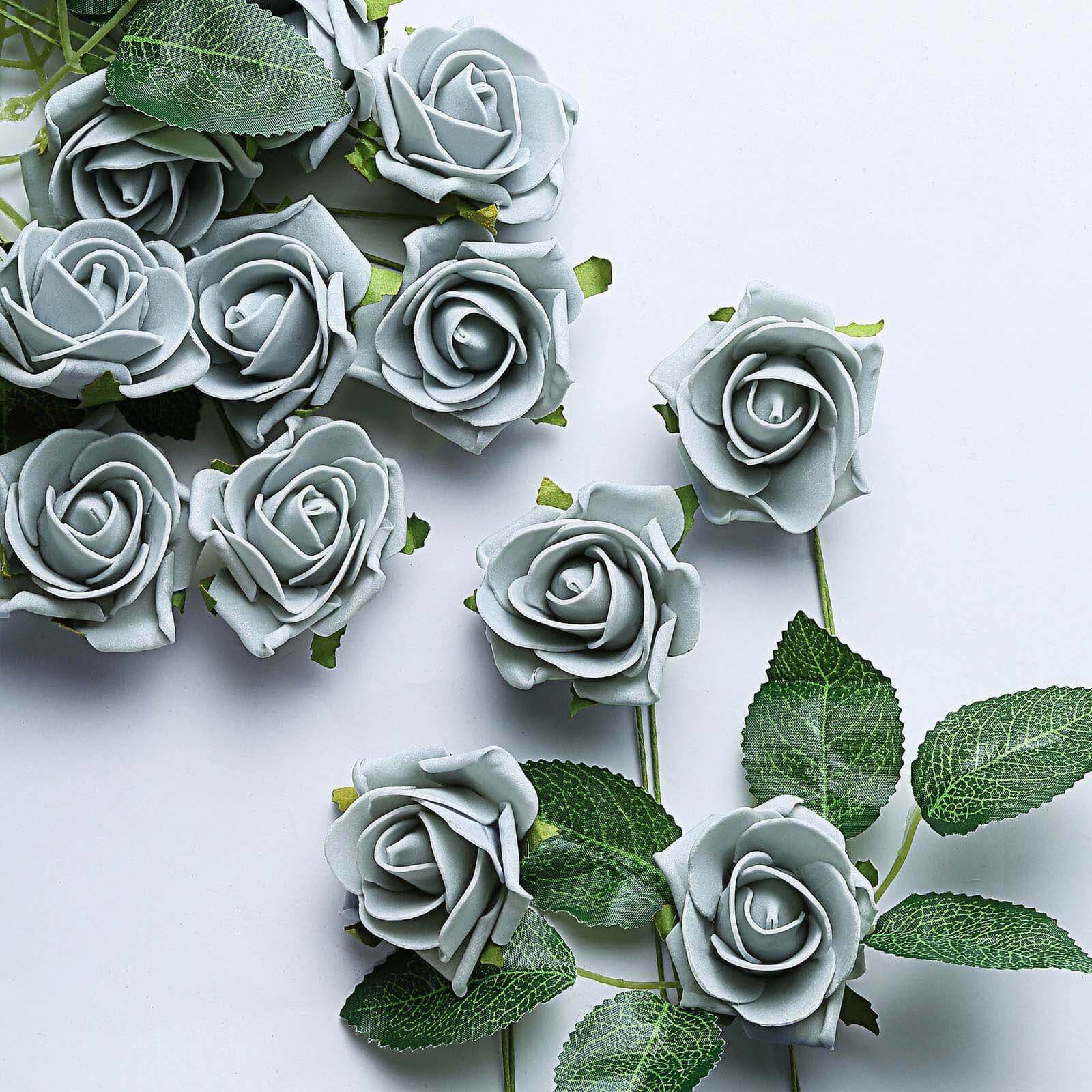 24 Roses 2" Silver Artificial Foam Flowers With Stem Wire and Leaves