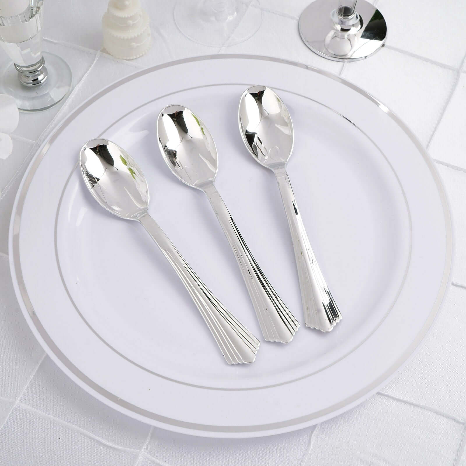 Create an elegant and sophisticated presentation at your upcoming special event or a festive meal with these classy disposable plastic spoons. The highly reflective. metallic look and a decorative handle coupled with fine silver finish makes these modern spoons appear highly elegant. Whether its a jubilant birthday party or a festive wedding reception; these spoons are an ideal choice for tea. coffee. salads. cakes. cereals. side dishes. fruits. desserts. appetizers. and more. These disposable plastic spoons are strong and sturdy. thus will avoid any leaking or spilling of food while eating. During exciting indoor events and summer fun activities. make dining and tidying a breeze with our special disposable plastic spoons.