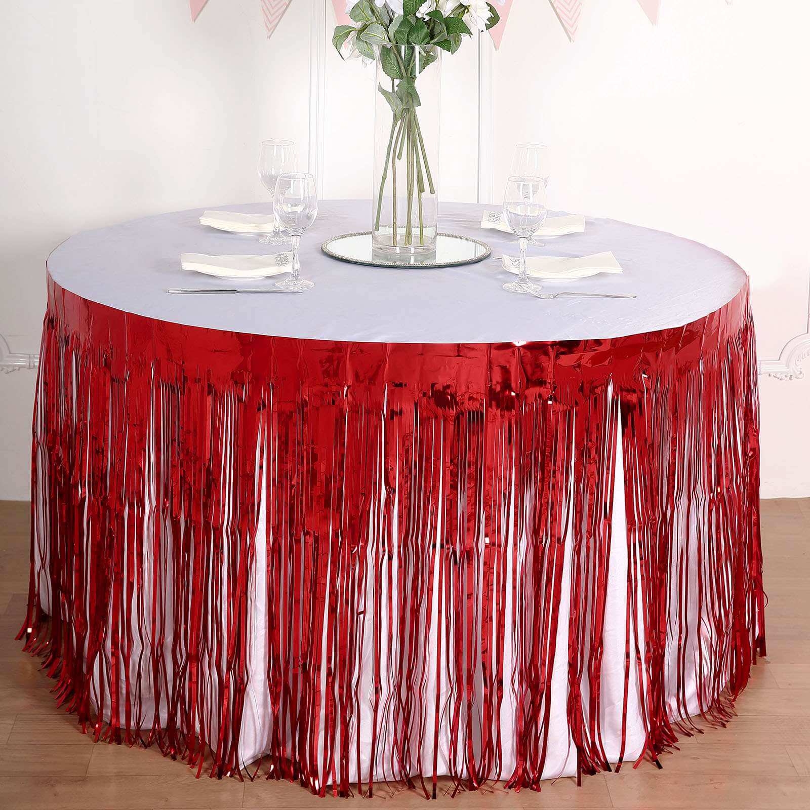 | Style: Metallic Foil Fringe Table Skirt |